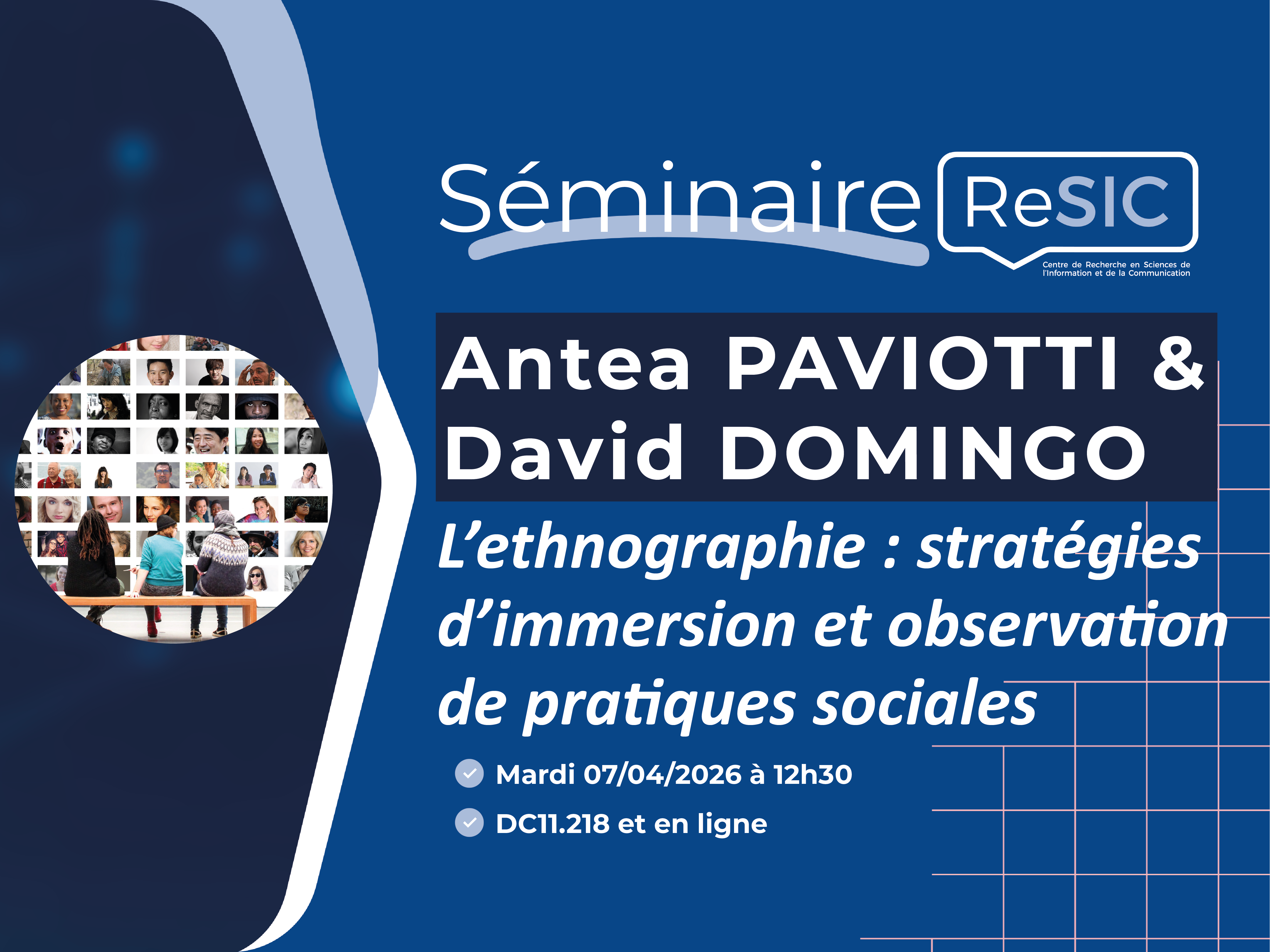 - Séminaire ReSIC 2025-26 - A. Paviotti et D. Domingo25 mars 2026L’ethnographie : stratégies d’immersion et observation de pratiques sociales