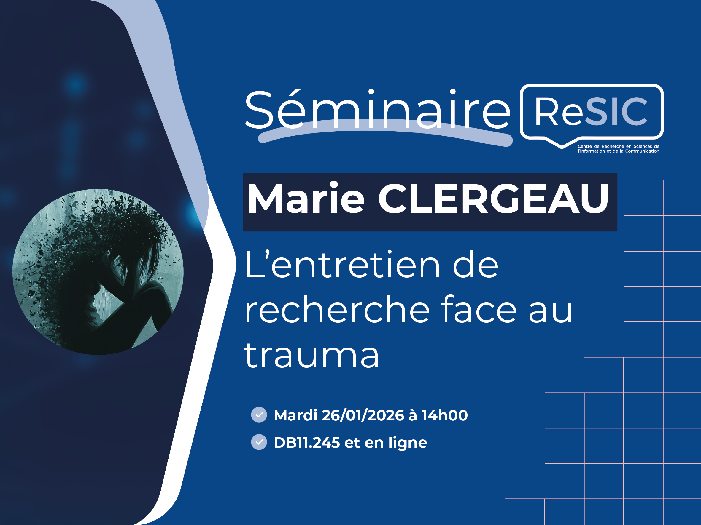 - Séminaire ReSIC 2025-26 - Marie Clergeau16 janvier 2026L’entretien de recherche face au trauma : écoute active, CNV et repères éthiques dans les recherches à sujets sensibles