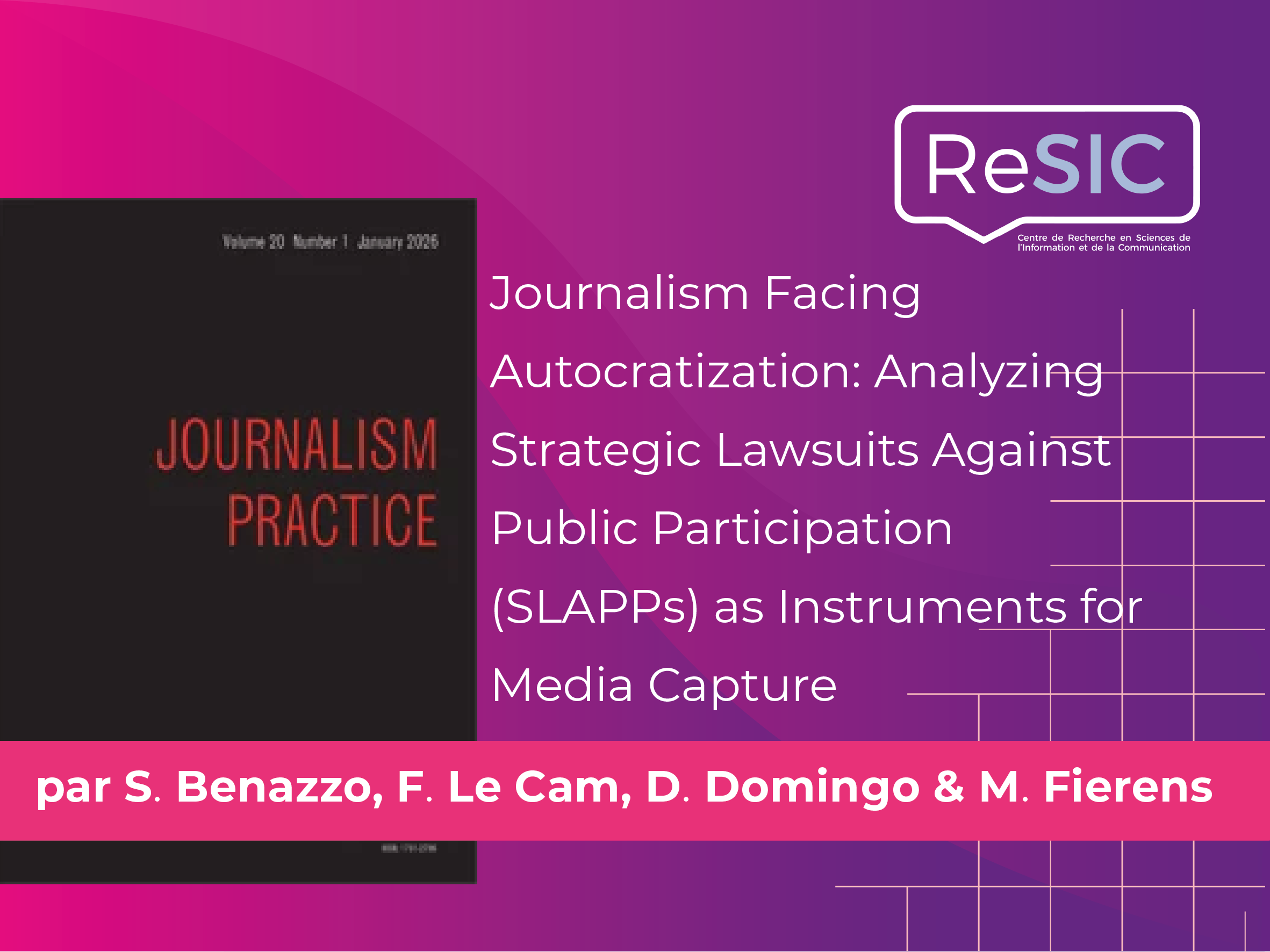 - Nouvelle publication: "Journalism Facing Autocratization: Analyzing Strategic Lawsuits Against Public Participation (SLAPPs) as Instruments for Media Capture"21 janvier 2026de Simone Benazzo, Florence Le Cam, David Domingo & Marie Fierens (2025)