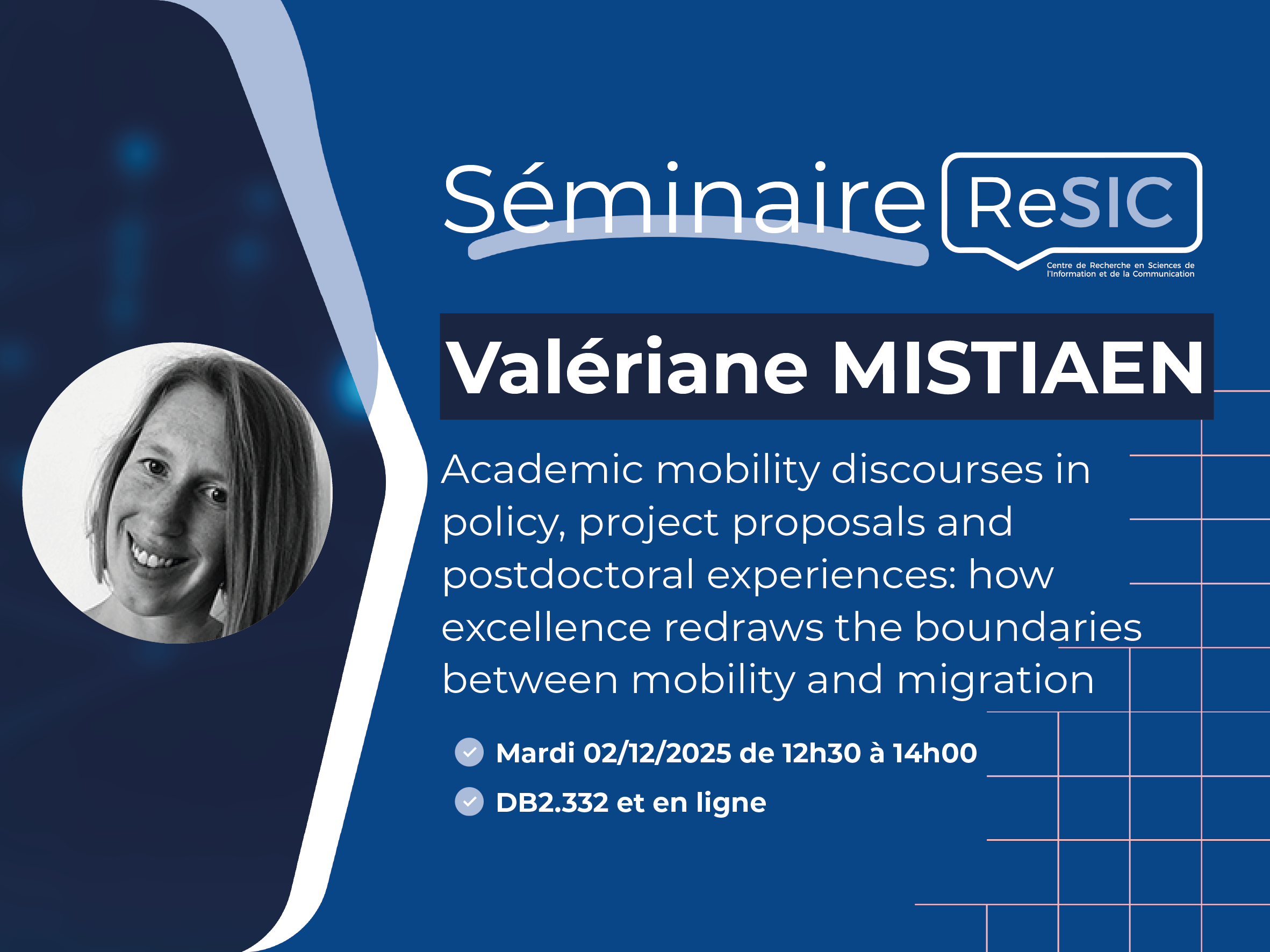 - Séminaire ReSIC 2024-2025 : Valériane Mistiaen18 mars 2025Le séminaire ReSIC accueillera Valériane Mistiaen, chercheuse post-doctorale FWO à la Vrije Universiteit Brussel (VUB) et titulaire d'un doctorat en information et communication (ULB-Université libre de Bruxelles) et en communication and media studies (VUB). Son intervention portera sur L’évolution du discours européen sur la migration et la construction de l’identité européenne.