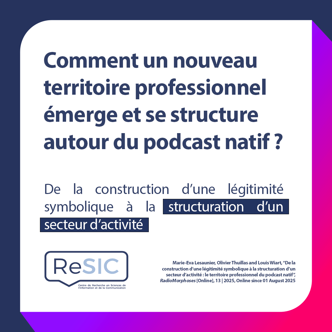 Références : M.-E. Lesaunier, O. Thuillas et L. Wiart (2025). "De la construction d'une légitimité symbolique à la structuration d'un secteur d'activité : le territoire professionnel du podcast natif ", RadioMorphoses [Online], 13 | 2025, Online since 01 August 2025.  DOI : https://doi.org/10.4000/14kse