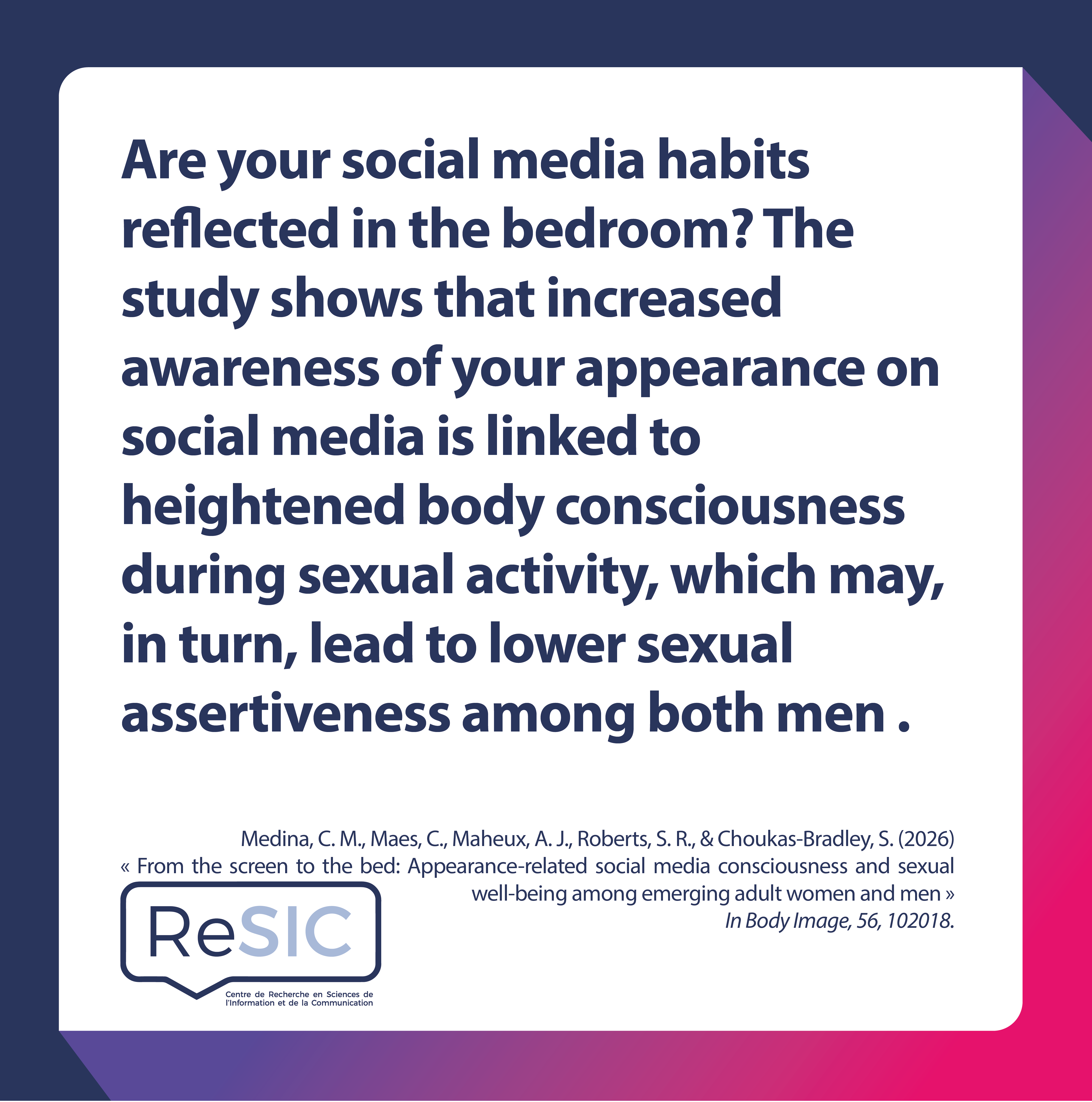 Références : Medina, C. M., Maes, C., Maheux, A. J., Roberts, S. R., & Choukas-Bradley, S. (2026). From the screen to the bed: Appearance-related social media consciousness and sexual well-being among emerging adult women and men. Body Image, 56, 102018.