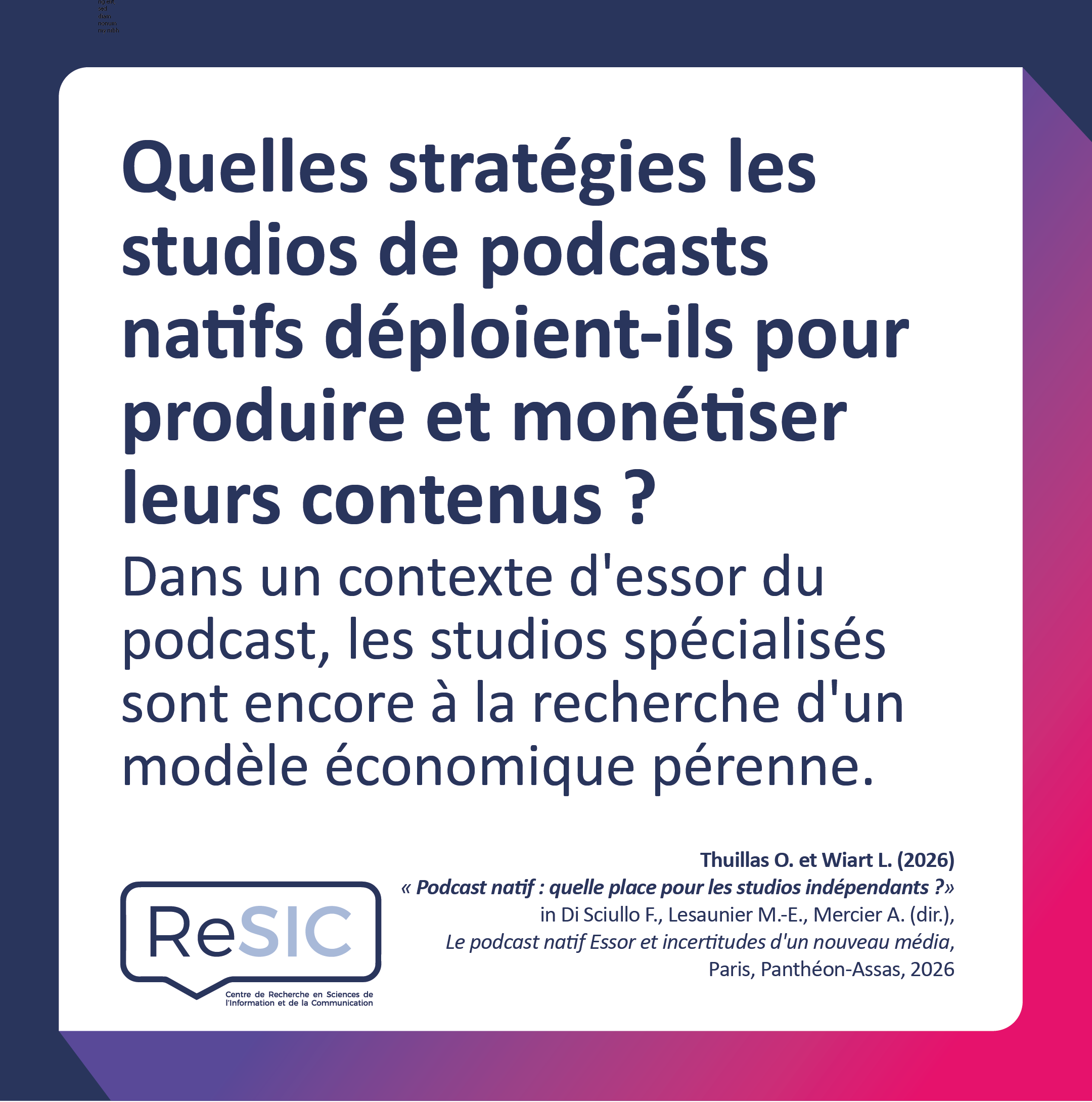 Références: Thuillas O. et Wiart L. (2026), "Podcast natif : quelle place pour les studios indépendants ?" in Di Sciullo F., Lesaunier M.-E., Mercier A. (dir.), Le podcast natif Essor et incertitudes d'un nouveau média, Paris, Panthéon-Assas, 2026